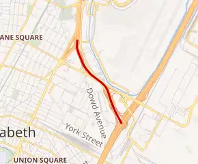 Route 81 heads northwest, running in between the travel lanes of North Avenue for a distance, with industrial areas located to the southwest and Newark Liberty International Airport to the northeast.[2] Upon splitting from North Avenue, Route 81 features a northbound ramp to Newark Liberty International Airport and has an interchange with Dowd Avenue.[1] From here, the route continues along the airport property with three northbound lanes and two southbound lanes maintained by the New Jersey Department of Transportation before reaching its terminus at U.S. Routes 1 and 9 just south of the Elizabeth–Newark city line. South of the terminus, ramps allow Route 81 traffic to access either the local or express lanes of US 1/9 as well as Newark Liberty International Airport.[1][2]