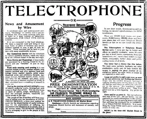 Incorporated in California in February 1912 by C. J. Ward, F. W. Bresse and S. H. Whisner. Demonstrations were begun on April 1, 1912 from 4th Floor of the Elks' Building.[34] In late 1913, provisions were made to lease a local theater, the Diepenbrock, to serve as a source for programming.[35] However, there was an abrupt change of plans, and instead the owners decided to merge their operations with the Pacific Telephone Herald Company.[36] The telephone newspaper service never became operational, either before or after the Pacific Telephone Herald merger. The company's charter was declared forfeited and repealed for non-payment of taxes in February 1915.[37]