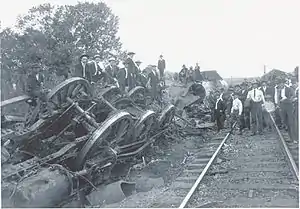 The trains met on New Market Hill at 10:18 am; the special managed to gather speed on the upgrade and was traveling at 60 mph (97 km/h); the local on the downgrade was trying to make up lost time and attained 70 mph (110 km/h); when they saw each other the emergency brakes were applied but the trains collided at a combined speed of over 100 mph (160 km/h) (though a contemporary source says 70 mph)[6] and the crash could be heard 15 miles (24 km) away. Both engineers were killed. The locomotive and its coal-tender of the local train were catapulted into the air, turning upside down they flew over the Special's engine, tender and baggage cars, landing squarely on top of the wooden passenger cars which were also struck from behind by the weight of the sturdy steel Pullman cars, which remained relatively undamaged. In seven seconds,[5] the wooden coaches were 'crushed like eggshells'.[1] Death was quick for most, with many of the victims decapitated or horribly mangled; 'splintered timbers, iron, and steel were piled in chaotic masses over the rails, mingling with human bodies'.[3] When news of the crash reached Knoxville, a relief train was organized to bring doctors and medical supplies to the site and take the injured to Knoxville General Hospital. Reporters also managed to board the train and many photographs of the scene were made. The official death toll was counted at 56 (with 106 injured),[3] though some estimates suggested the death toll could have been over 100.[5]