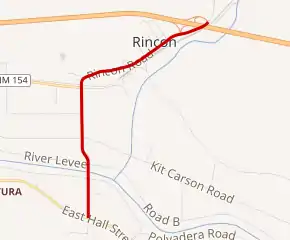 The highway begins at the junction with NM 185 south of Rincon. The road heads north through the fields of Rincon Valley and after 0.45 miles (0.72 km) crosses the Rio Grande river over a 400.3-foot-long (122.0 m) bridge, built in 1975. The road continues north through agricultural areas and at 1.300 miles (2.092 km) intersects with NM 154. The highway then turns northeasterly and travels through the community of Rincon, passing by BNSF Railroad Depot, proceeds under I-25 overpass, before reaching its northeastern terminus at intersection with I-25.