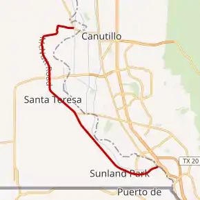 | Sunland Park | 0.000 | 0.000 | Anapra Road | Continues south as Anapra Road at the Texas state line | |