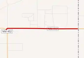 State Road 417 (NM 417) is a 4.75-mile-long (7.64 km) state highway in the US state of New Mexico. NM 417's western terminus is at NM 402 north of Nara Visa, and the eastern terminus is a continuation as Ranch to Market Road 3296 (RM 3296) at the Texas/ New Mexico border north-northeast of Nara Visa.