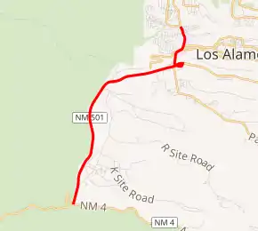 State Road 501 (NM 501) is a 7.323-mile-long (11.785 km) state highway in New Mexico, United States of America. NM 501's western terminus is at NM 4 west of Los Alamos. It runs northeast into the town of Los Alamos, where it ends. It passes through the territory of Los Alamos National Laboratory (LANL), which is closed to the public (the public may drive through on NM 501). Guard posts are at either end of the LANL section of the highway, and motorists passing into (but not out of) LANL territory must pause at the posts and be waved through. Under most conditions, no inspections, etc., are performed at the guard posts, but heightened security postures at LANL may lead to more intrusive checks.