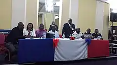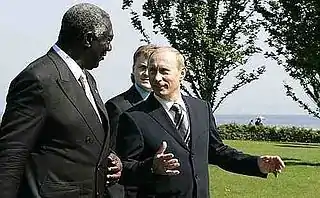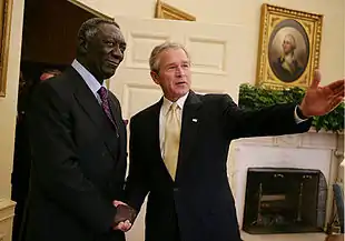 The New Patriotic Party (NPP) is a centre-right and liberal-conservative political party in Ghana.[4] Since the democratisation of Ghana in 1992, it has been one of the two dominant parties in Ghanaian politics, with its leading rival being the centre-left National Democratic Congress (NDC).[5] John Kufuor of the NPP was President of Ghana from 2001 to 2009.[6] At the elections held on 7 December 2004, the party won 129 out of 230 seats.[6] The NPP candidate was Kufuor, who was re-elected as president with 52.75% of the vote. The New Patriotic Party symbol is the African elephant and the New Patriotic Party colours are red, white, and blue.
