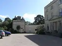 The house consists of a central stuccoed block of three floors with a basement divided into five bays, with a flanking pavilion of two stories in four bays, to either side connected by low flanking quadrant walls. In the centre of the front is a large classical pedimented portico fronted by four Ionic columns. The flanking walls screen the service wings behind. The rear elevation has on either side full-height semi-circular bays. The interior contains much Adam style decorative plasterwork, apparently the work of a certain Mr Powell referred to in the invoice from the builder Bellman,[26] and ornamental fittings. Robert Adam did much work for the Parkers at Saltram House near Plymouth between 1768–72 and 1779–82.[27] The Poles are likely to have been guests at their neighbours at this time, but in any case as they also spent much time in London at their house in Bedford Square, they would have been familiar with Adam's work in London and elsewhere. The north-east pavilion contains a theatre of circa 1900.[28] The top floor housed the servants' quarters.[29] The kitchens were originally situated in the left hand pavilion, later converted into a theatre.[30] A large Palladian style stables block is situated around a semi-circular courtyard, several hundred yards from the house, now converted into several separate residences. It had stabling for twelve horses and accommodation for grooms.