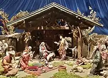During the Advent season and until the end of the Christmas season, the old Bavarian Christmas Nativity, from the wood sculptor Reinhold Zellner, born in 1903, can be visited in the Prunkhof of the town hall (inner courtyard) in direct proximity to the Christkindlmarkt. The Christmas nativity was designed by the artist for the Christkindlmarkt in 1954 and consists of 33 figures, which are dressed in oriental and alpen style, and 28 animals. As a special feature, the crucifix carrier is included, which leads anachronistically to the birth of Jesus with a crucifix. Over the decades, some figures disappeared, and weather and aging-related damages affected the entire ensemble. In the year 2000, a comprehensive restoration of the art work took place for 30,000 DM, in the course of which the lost nativity figures were replaced. With the completion of the renewal work, the nativity became the property of the Munich Tourist Board.[12]