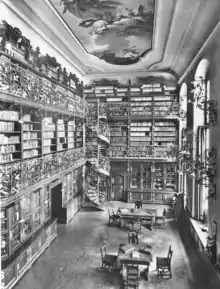 The Ratskeller was painted by the Biebrich painter Heinrich Schlitt, and officially opened as a restaurant in the six cross-vaults in the basement of the new town hall on 1 August 1874 by the first Ratskeller-Wirte couple Ernst and Franziska Steidl.[13] The present painting of the Munich Rathskeller was originally designed for Hauberrissers Ratskeller in the town hall St. Johann. Hauberisser had proposed Schlitt to do the painting in the St. Johanner Ratskeller. The theme of the planned painting was "The Battle of Beer Against Wine".[14] Heinrich Schlitt had already been an artist known in the Saar region, and among other things, he designed ceramics for Villeroy & Boch at the beginning of the 20th century.[15] Schlitt also coined the "Bierkeller"[16] with humorous frescoes in co-operation with colleagues starting in the year 1890, in the Ratskeller of the New Town Hall in Wiesbaden, which was also designed by Georg von Hauberrisser.[17]