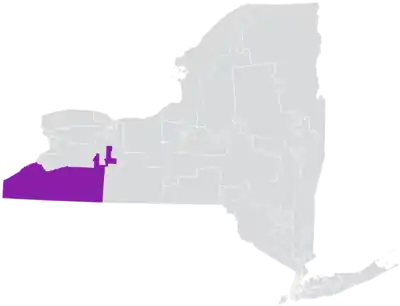 District 57 is located in the far southwestern corner of Upstate New York, including all of Allegany, Cattaraugus, and Chautauqua Counties, as well as parts of Livingston County.[1][4]