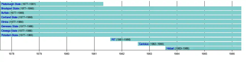 With the NCAA instituting a Division II Championship beginning with the 1977–78 season 8 upstate New York schools formed the NYCHA to have a better chance at securing one of the bids. So as to not lose those member schools, ECAC 2 began holding two separate conference tournaments the same year, (East and West), allowing those 6 teams to compete with other established division II schools for an NCAA bid. Plattsburgh State left the conference in 1981 and was replaced by RIT. The Conference added Canisius and Hobart over each of the succeeding two seasons but by 1986 the effort to keep the conference as a separate entity stopped and the NYCHA was dissolved.[2]