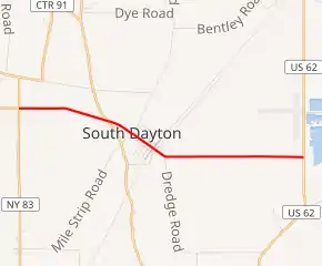 New York State Route 322 (NY 322) is a state highway in the Southern Tier of New York in the United States. The western terminus of the route is at an intersection with NY 83 in Balcom Corners, a hamlet within the Chautauqua County town of Villenova. Its eastern terminus is at a junction with U.S. Route 62 (US 62) in the Cattaraugus County town of Dayton. In between, the route passes through the village of South Dayton.