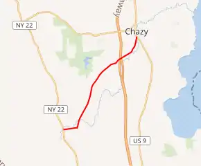 New York State Route 348 (NY 348) was a state highway located within the town of Chazy in Clinton County, New York, in the United States. It stretched for 6.2 miles (10.0 km) from NY 22 in the hamlet of West Chazy to U.S. Route 9 (US 9) in the hamlet of Chazy and passed under the Adirondack Northway (Interstate 87 or I-87). NY 348 did not intersect any state routes or pass through any communities other than those at each of its termini.