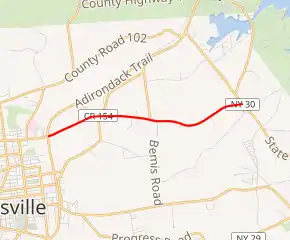 In 1908, the New York State Legislature created Route 24, an unsigned legislative route that initially extended from Fonda to Speculator via Gloversville and Mayfield. From Gloversville to Mayfield, Route 24 was routed on SH 33, which broke from East State Street at modern CR 154 and followed CR 154 toward Mayfield.[6][10] In the mid-1920s, all of legislative Route 24's original routing was designated as part of NY 54, a U-shaped route that began in Utica and passed through Poland, Wilmurt, Speculator, and Gloversville before ending in Fonda.[9][11]