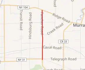 New York State Route 387 (NY 387) is a 2.95-mile (4.75 km) state highway located within the town of Murray in Orleans County, New York, in the United States. It serves as a north–south connector between NY 31 in the hamlet of Fancher and NY 104 (Ridge Road) midway between the hamlets of East Gaines and Murray. In between, NY 387 crosses the Erie Canal and passes through the community of Brockville. The route was assigned to its current alignment as part of the 1930 renumbering of state highways in New York.