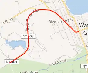 NY 409 begins at a grade crossing with the Norfolk Southern Railway in the town of Dix,[3] where maintenance of Station Road shifts from Dix to the New York State Department of Transportation.[4] The route initially heads to the northeast through an isolated rural area, running along the northern fringe of Watkins Glen State Park to the western edge of a valley overlooking Seneca Lake and the village of Watkins Glen. Here, NY 409 turns northward, slowly descending into the gorge as it crosses into the town of Reading. After 0.5 miles (0.8 km), the route curves back to the east and rapidly descends in elevation on its way into the village of Watkins Glen.[3]