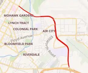 Then at another roundabout it meets Hangar Road, a local street providing direct access to the airport, NY 825 turns to the northwest, following Mohawk Drive toward the western extent of the former Griffiss Air Force Base grounds. The road comes to a junction with Bell Road, the last street that NY 825 meets within the business park. Past Bell Road, the route curves the northwest and exits the park as it crosses over the Mohawk River and enters a more densely developed area of Rome. NY 825, now named East Chestnut Street, continues onward for three blocks into a commercialized area north of downtown Rome, where it ends at a junction with Black River Boulevard (NY 46).[3] All of NY 825 is maintained by the city of Rome.[4]