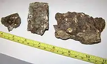 The Newark Supergroup consists largely of poorly sorted nonmarine sediments; typical rocks are breccia, conglomerate, arkose sandstone, siltstone, and shale.[3][4] Most of the strata are red beds that feature ripple marks, mud cracks, and even rain drop prints; dinosaur footprints are common, though actual body fossils are very rare.[4] Some of the strata are detailed to the level of varves, with indications of Milankovitch cycles.[5] In preserved lake sediments, Semionotus fossils are especially common.[5]