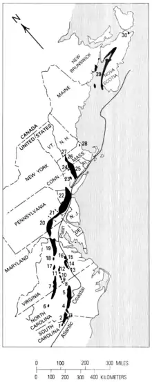 The Newark Supergroup, also known as the Newark Group, is an assemblage of Upper Triassic and Lower Jurassic sedimentary rocks which outcrop intermittently along the United States East Coast. They were deposited in a series of Triassic basins approximately 190 million years ago[2][1] as North America separated from Africa. The exposures extend from Nova Scotia to North Carolina. Related basins are also found underwater in the Bay of Fundy. The group is named for the city of Newark, New Jersey.