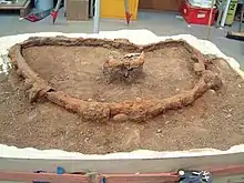 The excavation of the Newbridge chariot burial was carried out by a team from Headland Archaeology and conservators from the National Museum of Scotland.[1] The excavation revealed that the pit would have been little larger than the chariot. It was dug to the depth of the axle then two smaller pits were cut into its base to receive the wheels. A narrower slot accommodated the chariot pole but broadened at the end for the yoke. From the outset it was clear that the iron tyres and other metal fittings around each wheel were well-preserved and it was decided to lift each wheel in a block of soil, allowing specialist excavation and conservation under laboratory conditions.