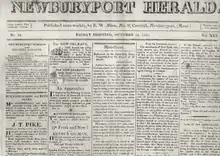 The Newburyport Herald (1797–1915) was a newspaper published in Newburyport, Massachusetts in the 19th century. It began in 1797 with the merger of two previous newspapers, William Barrett's Political Gazette and Angier March's Impartial Herald.[1] Employees included abolitionist William Lloyd Garrison and James Akin.[2]