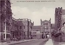 Unlike the majority of other students' unions in the United Kingdom, Newcastle University Students' Union owns the building where it is housed. The Union building was built in 1924 with a gift from an anonymous donor, who is believed to have been Sir Cecil Cochrane, a major benefactor to the university.[3] It is built in the neo-Jacobean style and was designed by the local architect Robert Burns Dick whose firm designed the Laing Art Gallery, the towers of the Tyne Bridge and The Spanish City in Whitley Bay. It was opened on 22 October 1925 by the Rt. Hon. Lord Eustace Percy, who later served as Rector of King's College from 1937 to 1952. In 1987 the Students' Union was made a Grade II listed building.[4]