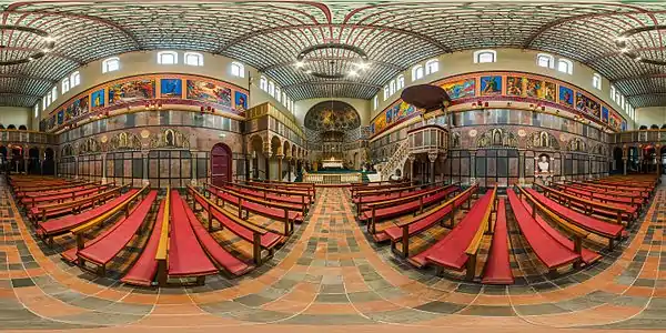 The interior is richly decorated with a baldacchino over the altar. The semi-dome above the sanctuary was inspired by the apse of the Basilica of San Clemente al Laterano, Rome. There is also an arcaded gallery with screens and an elaborate pulpit. The walls are decorated with marble and serpentine from many parts of Ireland.[14] The empty undercroft represents the empty tomb, just as at Westminster Cathedral.[15]