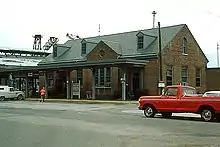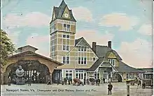 Ferry service between Norfolk and Newport News began in 1883, though the first passenger train station at Newport News was not built until 1892.[3] The multi-story brick structure, Victorian with a large clock tower,[4] was built on the waterfront at 23rd Street. A train shed stretched onto a pier so that passengers could transfer directly between trains and ferries.[2]