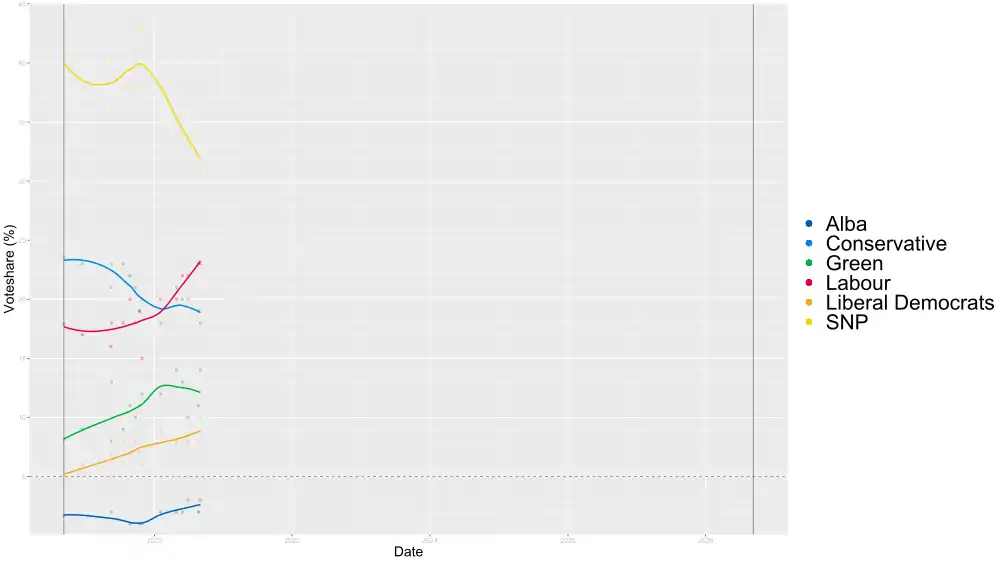 Under the Scottish Elections (Reform) Act 2020, an ordinary general election to the Scottish Parliament would normally be held on the first Thursday in May five years after the 2021 election, i.e. in May 2026.[1] This Act superseded the 1998 Scotland Act, which had set elections in every fourth year.[2]