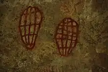 The painting of a hashed oval shape is often presumed to be a sea turtle shell, a prominent food source for the Ngaro and Aboriginal people of the mainland. However, it may represent the fruit of the pandanus plant and its seed.
