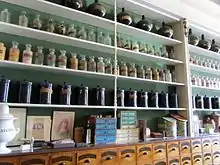 The glass bottles, jars, and pots that line the shelves are the same ones that had been taken by Coyne in 1922.[13] He had sold some of them to a private party, and these would later be purchased by the Academy of Medicine in Toronto.[13] The Academy of Medicine loaned these to the Ontario College of Pharmacy for use at the Niagara Apothecary. The remainder were sold by Coyne's widow to the Ontario College of Pharmacy.[13] Other artefacts displayed at the museum were obtained from private donors, the Faculty of Pharmacy at the University of Toronto, and from the collection of the Ontario College of Pharmacy.[13]