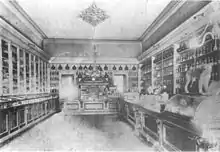 The interior is furnished and decorated in a style typical of a Confederation-era apothecary.[18] The counters and cabinets, made of black walnut and butternut, are complemented by an ornate wooden dispensary and a crystal gasolier.[18] The dispensary includes a clock, a carved beaver, and two light globes held by female figures.[19] Venetian blinds, hanging from the window valance dating to 1866, were disused for a period when an awning was installed.[14]