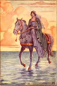 - Niamh came from beyond the sea westwards, riding a white steed, and found the Fianna on a deer hunt near Loch Léin (in Co. Kerry).[lower-alpha 1][4]