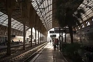 Nice-Ville station (French: Gare de Nice-Ville), also known as Nice-Thiers station (Gare de Nice-Thiers), is the main railway station of Nice, France. It is situated on the Marseille–Ventimiglia railway and constitutes the southwestern terminus of the Nice–Breil-sur-Roya railway. Nice-Ville is served by TER, Intercités and TGV services, as well as the Gare Thiers stop on Line 1 of the Nice tramway.