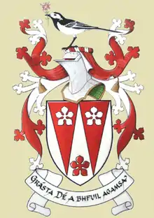 Williams's coat of arms was granted by the Chief Herald of Ireland on 1 November 2006. The escutcheon's formal blazon is in Irish,[4] translated here as Argent two piles throughout gules three cinquefoils counterchanged ('On white, two red triangles throughout the shield, three cinquefoils in the reverse colour'); the colours are those of the City of London, and the piles form a W. Along with this was granted a crest,[5] On a wreath of the colours a pied wagtail bearing in its beak Ragged Robin all proper ('On a red and white wreath, a pied wagtail bearing in its beak ragged robin, all in their natural colours'). "Willie wagtail" is common name used for this bird in Ireland.[6] The motto is Grásta Dé a bhfuil agamsa "The Grace of God is all I have"—a pun, where a bhfuil agamsa [ə ˌwɪlʲ ˈaːmˠsˠə] plays on Williams.