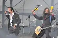 They were a leader of Melbourne's post-punk scene in the late 1970s, playing hundreds of live shows in Australia before changing their name to the Birthday Party in 1980 and moving to London, then West Berlin. Cave's Australian girlfriend and muse Anita Lane accompanied them to London. The band were notorious for their provocative live performances which featured Cave shrieking, bellowing and throwing himself about the stage, backed up by harsh pounding rock music laced with guitar feedback. Cave utilised Old Testament imagery with lyrics about sin, debauchery and damnation.[18] Cave's droll sense of humour and penchant for parody is evident in many of the band's songs, including "Nick the Stripper" and "King Ink". "Release the Bats", one of the band's most famous songs, was intended as an over-the-top "piss-take" on gothic rock, and a "direct attack" on the "stock gothic associations that less informed critics were wont to make". Ironically, it became highly influential on the genre, giving rise to a new generation of bands.[19]