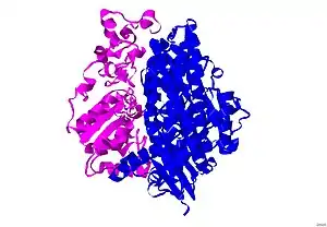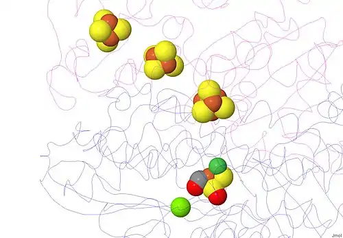 The structure of [NiFe] hydrogenase was obtained from x-ray crystallography studies of five different sulfate-reducing bacteria: D. vulgaris Miyazaki F,[6] D. gigas,[7] D. frutosovorans,[8][9] D. desulfuricans[10] and Desulfomicrobium baculatum.[11] The [NiFe] hydrogenase isolated from D. vulgaris Miyazaki F is shown in Figure 2. The larger subunit is in blue, has a molecular mass of 62.5 kDa, and houses the Ni-Fe active site. The smaller subunit is in magenta, has a molecular mass of 28.8 kDa, and contains the Fe-S clusters (see Iron-sulfur cluster).