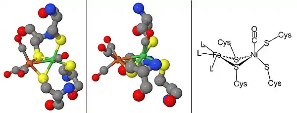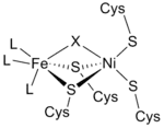 From the infrared spectra and X-ray crystallography studies, the [NiFe] hydrogenase active site was found to be (S-Cys)4Ni(μ-X)Fe(CO)(CN)2, in which the generic ligand X is either an oxide, sulfur, hydroperoxide, or a hydroxide found in an oxidized state only (Figure 3).[12] While the nickel atom participates in redox reactions, the iron atom is consistently in a Fe(II) coordination state.[12] The exact geometry of the three non-protein ligands (denoted as L) coordinating to the Fe metal ion is not known; however, they were identified as one carbon monoxide (C≡O) molecule and two cyanide (−C≡N) molecules.[13]