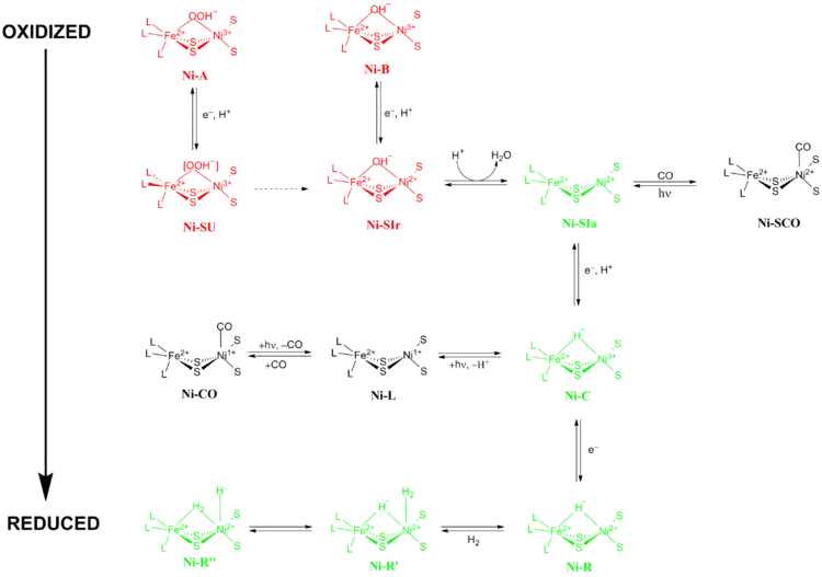 The three most important catalytic redox active states of [NiFe] hydrogenases are Ni-SIa, Ni-C and Ni-R (which have three different variations:).[13] The light-sensitive Ni-C state can be obtained via one electron reduction of Ni-SIa. The electron paramagnetic resonance spectroscopic studies of the Ni-C state, which contained a Ni3+ with S=1/2 (see Spin-1/2) and a hydride bridging the two metals Ni and Fe, showed that the heterolytic cleavage of H2 takes place in the [NiFe] hydrogenase active site.