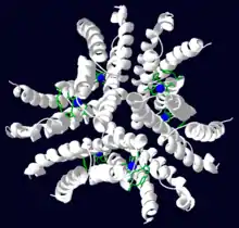 Ni-SOD is a globular protein and is shaped like a hollow sphere. It is homohexameric, meaning that it is made up of six identical subunits. Each subunit is a bundle of four right-handed α-helixes and has a molecular mass of 13.4 kDa (117 amino acids).[5] The subunits align to give Ni-SOD a three-fold axis of symmetry.[1] There are six nickel cofactors in total (one for each subunit). The subunits also have a hydrophobic core, which helps drive protein folding. The core is made up of 17 aliphatic amino acids.