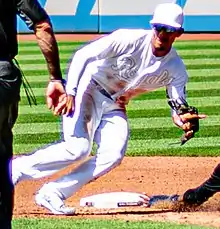 During 2021 Spring Training, Lopez switched his number from 1 to 8 to allow Jarrod Dyson to wear number 1. Having hit .118 in 34 at-bats in Spring Training, Lopez was optioned to Triple-A Omaha, with Whit Merrifield expected to assume the starting second baseman role.[16] However, an injury to shortstop Adalberto Mondesí in the final game of Spring Training forced him onto the injured list, and Lopez began the regular season as the Royals shortstop.[17] Mondesí was activated and made his season debut on May 25, but returned to the injured list with a separate injury on June 6.[18][19] Lopez was listed on the Royals All-Star ballot at the designated hitter position, despite not having played a game there during the season, as the team put Mondesí on the ballot at shortstop and Merrifield at second base.[20] On August 19, Lopez hit his first home run of the season in a 3-6 loss against the Houston Astros.[21] Lopez ended 2021 with 78 runs, 43 RBIs, 22 stolen bases and a .300 batting average, becoming the first regular Royals shortstop to bat .300 or better in a season.[22] Defensively, he led all qualifying AL shortstops with a .987 fielding percentage.