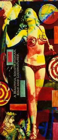 Filippo's most notable collage elements are nude figures of men and women, generally vintage, with playful text and bits of Americana found or acquired. Multiple layered and strongly colored these small collages radiate color and flow with gesture.[2] The early works consisted of printed transparencies laid over painted cardboard with collage underneath and over. Later works consist entirely of assorted paper.