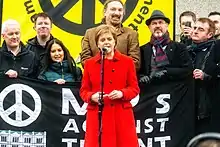 On 19 September 2014, independence was rejected in the Scottish independence referendum, with 55.3% of the voters voting no and 44.7% voting yes.[41] Following the defeat of the Yes Scotland campaign, Salmond announced his resignation as First Minister and Leader of the SNP. Sturgeon immediately announced that she would be a candidate in the election to replace him, and received huge support from the SNP hierarchy.[42][43][44] Sturgeon said that there would be "no greater privilege" than to lead the SNP. On Salmond's resignation, Sturgeon said:
