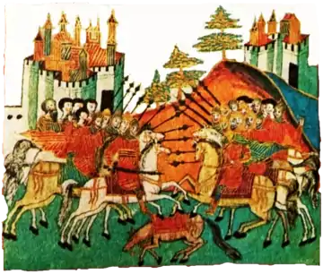 An interpretation of Nicolae's role in Moldavia is found in 18th-century variant of Letopisețul Cantacuzinesc, which claims that Michael ordered Radu Buzescu to arrange Nicolae's departure for Iași. The same source reports that Michael changed his mind as the expedition was starting, and instead placed Moldavia under a regency.[78] According to historian N. Grigoraș, the Moldavian move may have been vetoed by Stanca, although some of the Moldavian boyars had proved welcoming.[79] One contemporary account claims that Michael no longer wanted "his little son" as ruler of a "a borderland, for he was still fearful of Ieremia Voivode". As noted by Rezachevici, this may in fact refer to his awareness that the Polish army of Stanisław Żółkiewski was preparing the reconquest of Moldavia.[80] Under this Wallachian ascendancy, Moldavia's throne was most probably being prepared for Marcu Cercel.[81] The regency council which then emerged is generally believed to have comprised Andronikos, Hetman Udrea Băleanu, Spatharios Negrea, and Armaș Sava.[82]