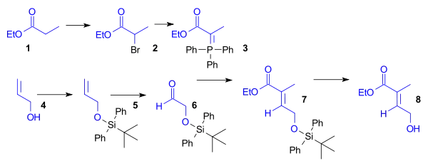 The ethyl ester of propionic acid (1) was brominated and then converted to the Wittig reagent using triphenylphosphine. Aldehyde 6 was obtained from allyl alcohol (4) by protection as the tert-butyldiphenylsilyl ether (5) followed by ozonolysis. Wittig reagent 3 and aldehyde 6 reacted in a Wittig reaction to give unsaturated ester 7, which was deprotected to give dienophile 8 (Scheme 1, compound 1).