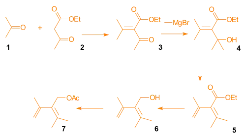 Aldol condensation of acetone and ethyl acetoacetate gave β-keto-ester 3. A Grignard reaction involving methylmagnesium bromide provided alcohol 4, which was subjected to acid catalyzed elimination to give diene 5. Reduction and acylation gave diene 7 (Scheme 3, compound 1).