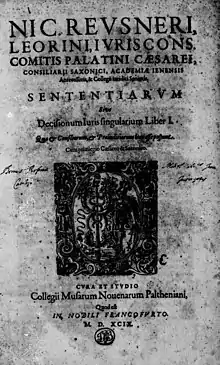 Nicolaus Reusner (also von Reusner, Reusnerus; 15451602) was a German jurist and publisher. He was born into a family of wealthy German landowners in Löwenberg, Silesia, who had recently moved there from Transylvania. Several members of his family became famous in the fields of law and medicine in the 16th century, including his brothers Bartholomäus von Reusner (1532–1572, medicine), Elias Reusner (1555–1612, history and medicine) and Jeremias von Reusner (law). Reusner studied in Wittenberg and Leipzig, under Modestinus Pistoris, and Leonhard Badehorn. In Leipzig, imperial personal physician Georg Wirth (1524–1613) persuaded him to abandon medicine and study law.