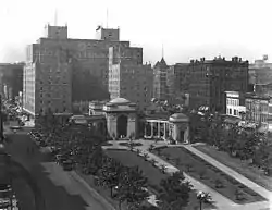 The original hotel on the site (often called the Nicollet House Hotel) was built in 1858. Named for Joseph Nicollet, the hotel quickly became a landmark and many of the city's early prominent figures such as John S. Pillsbury and William D. Washburn worked out of it.[1] Over the next half-century it was expanded and remodeled several times, but by the 1920s found itself obsolete. In 1922 city inspectors ordered the installation of a fire sprinkler system which the owners deemed too expensive. The old hotel was demolished in 1923.[2]