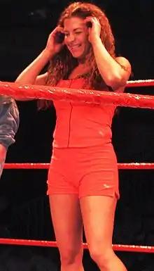 Guenard debuted on the SmackDown! brand on the June 6, 2002 episode, in a backstage segment with The Hurricane (who was her on-screen ex-boyfriend) and Jamie Noble. Noble and Guenard then became an on-screen couple in a "trailer trash" gimmick.[4] They were both playing as heels, with Nidia leading Noble to several wins, due to interference during the matches. At the King of the Ring she led Noble to winning the Cruiserweight Championship from The Hurricane.[5] She then began to feud with SmackDown! Diva Torrie Wilson leading to many solo and mixed tag team matches with Guenard and Noble against Wilson and various other cruiserweights, including Funaki, Billy Kidman, Rey Mysterio, and Brian Kendrick.[6][7][8][9][10]