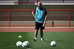 Frederiksen is noted for his exceptional work with young talents, developing players such as Andreas Christensen, Andreas Bjelland, Yussuf Poulsen and Christian Nørgaard in Lyngby, and Martin Braithwaite at Esbjerg.[1] He has furthermore shown flexibility in regards to formations, employing a 3–4–3 formation at Denmark U21,[1] but also utilising a classic 4–4–2.[2] In Brøndby, Frederiksen started out employing a 4–3–3, but since adjusted this to a dynamic 3–5–2 with attacking wingbacks, Andreas Maxsø as the anchor in defense and a fast and more stationary centre forward as the main forwards.[3][4] Frederiksen is a proponent of pressing, in what he has called a balanced press. This implies striking a balance between immediately attempting to win back possession high up the pitch, and falling back and regrouping in defence.[5][1][6]