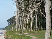 The municipality lies on the Baltic Sea coast between the oldest German seaside spa of Heiligendamm and Warnemünde. Large parts of the municipal territory are forested. West of the village lies Nienhagen Wood (Nienhäger Holz) immediately behind the high sea cliffs which roughly measure roughly 12 m (39 ft). This mixed forest is circa 180 hectares (1.8 km2) in area and is called Ghost Wood (Gespensterwald) by the locals. The origin of this description is not exactly known, but is probably derived from its coastal strip of the wood, which 1,250 m (4,100 ft) long and around 100 m (330 ft) wide, and is mainly stocked with beech and a few oaks. The beech trees, in particular, have been shaped by the sea winds, grow mainly on one side and have twisted, snake-like branches, which gives them a ghostly appearance especially at twilight and in the mist.