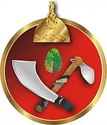 Much of this heraldry (including a great deal of that which is connected to members of the Nigerian chieftaincy system, such as the Erunmu badge rendered here) is composed of similar imagery. For example, both the Erunmu badge and the Okpe one - as well as the flag of the Aro Confederacy from earlier - include blades of some kind. Although these usually take the form of Ida swords, Erunmu's badge displays a machete instead. Both this and the accompanying hoe are an obvious reference to the Owu's long history of farming.